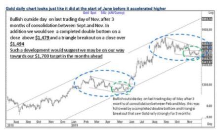 Fitzpatrick指出,在9月至11月三个月盘整之后,金价在11月最后一个交易日出现看涨外包日线。假如金价日收盘位于1479美元/盎司上方,这将完成双底形态的构建。