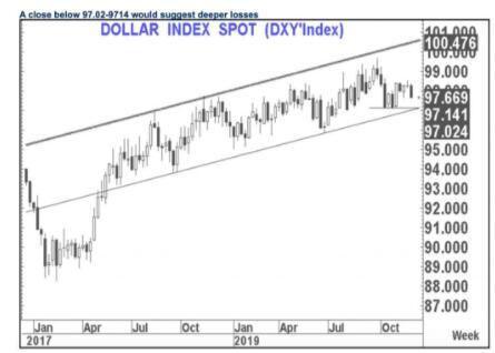 Fitzpatrick表示,目前美元指数形态看上去是一个双顶,颈线在97.68。随着美元指数日收盘跌破了这一水平,这表明美元指数目标将至少瞄准96.90,或者较近期高点回落1.5%左右。