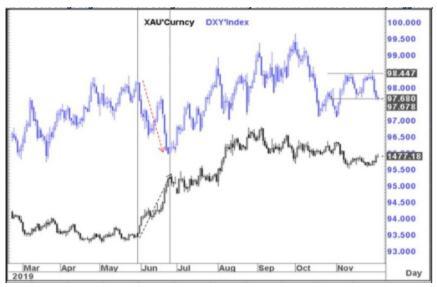(美元指数与现货黄金日线图)