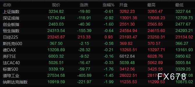 美股三大指数全线收跌,标普500指数收盘下跌59.90点,跌幅1.76%,报3339.05点;纳斯达克指数收盘下跌222.00点,跌幅1.99%,报10919.59点;道琼斯指数收盘下跌405.90点,跌幅1.45%,报27534.58点。