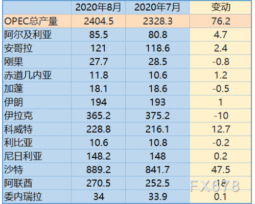 二手资料显示,8月份OPEC原油产量增加76万桶/日,伊朗8月原油产量增加1.0万桶/日至194.0万桶/日,沙特8月原油产量增加47.5万桶/日至889.2万桶/日,伊拉克8月原油产量减少10.0万桶/日至365.2万桶/日,科威特8月原油产量增加12.7万桶/日至228.8万桶/日,利比亚8月原油产量减少0.2万桶/日至10.6万桶/日。阿尼日利亚8月原油产量增加0.2万桶/日至148.2万桶/日,委内瑞拉8月原油产量增加0.1万桶/日至34.0万桶/日,阿联酋8月份原油产量增加了18万桶/日。