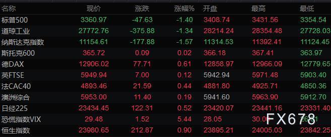 美股三大指数均跌超1%,标普500指数收盘下跌47.70点,跌幅1.40%,报3360.95点;纳斯达克指数收盘下跌178.20点,跌幅1.57%,报11154.33点;道琼斯指数收盘下跌375.90点,跌幅1.34%,报27772.76点。
