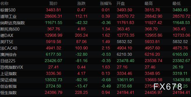 美股三大指数收盘涨跌不一,道琼斯指数收盘上涨112.10点,涨幅0.39%,报28606.31点;标普500指数收盘上涨0.50点,涨幅0.01%,报3483.81点;纳斯达克指数收盘下跌42.30点,跌幅0.36%,报11671.56点。