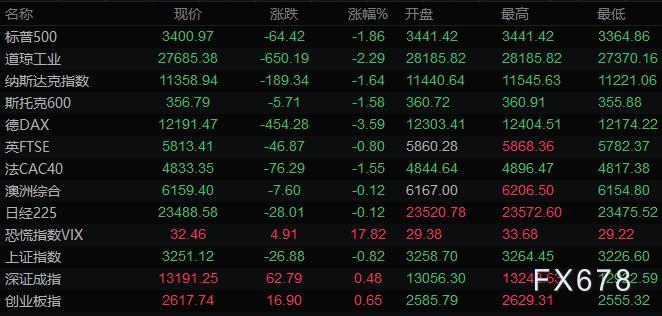 美股三大指数大幅收跌,道琼斯指数收盘下跌649.90点,跌幅2.29%,报27685.64点;标普500指数收盘下跌64.40点,跌幅1.86%,报3400.97点;纳斯达克指数收盘下跌189.30点,跌幅1.64%,报11358.94点。