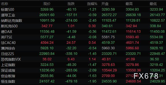 美股三大指数全线收跌,道琼斯指数收盘下跌157.50点,跌幅0.59%,报26501.60点;标普500指数收盘下跌40.10点,跌幅1.21%,报3270.04点;纳斯达克指数收盘下跌274.00点,跌幅2.45%,报10911.59点。