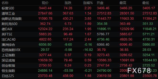 美股三大指数连续三个交易日大幅收涨,道琼斯指数收盘上涨367.60点,涨幅1.34%,报27847.66点;标普500指数收盘上涨74.30点,涨幅2.20%,报3443.44点;纳斯达克指数收盘上涨430.20点,涨幅3.85%,报11590.78点。