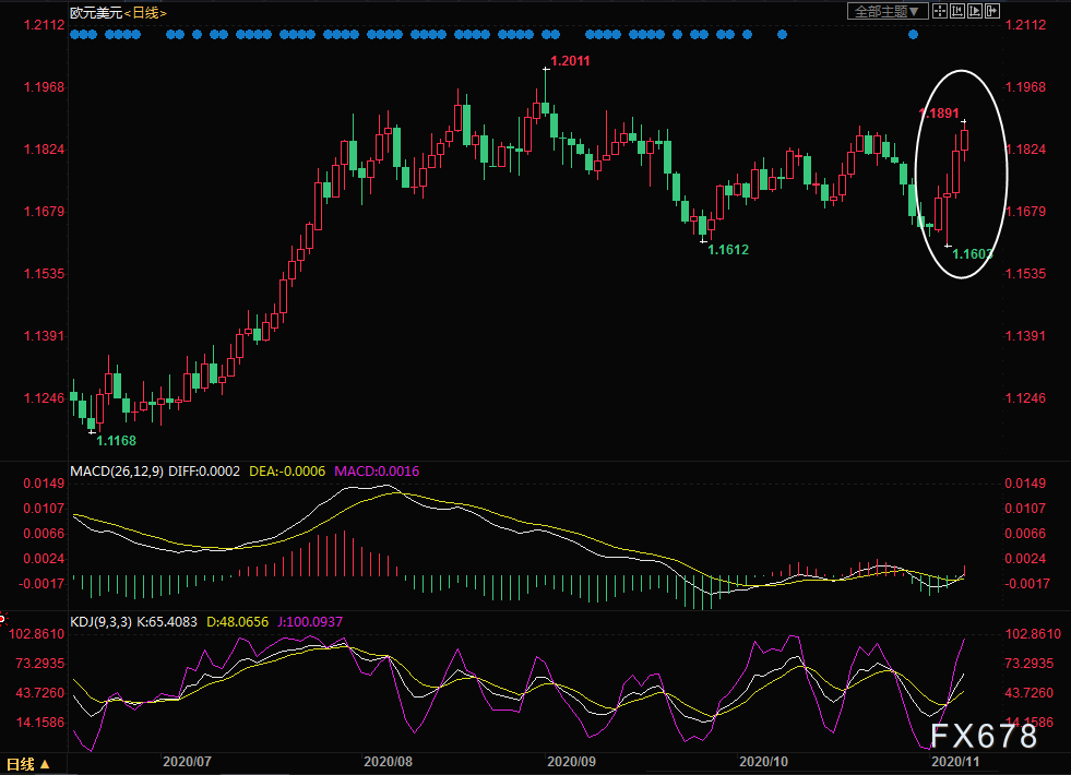 市场预期若拜登获胜,将有某种形式的财政刺激措施和加税政策,这种结果对美元不利。另外若拜登当选使国际贸易紧张关系得到缓和,也利好欧元。欧元兑美元四天累计上涨了近2%,一度触及1.1891。