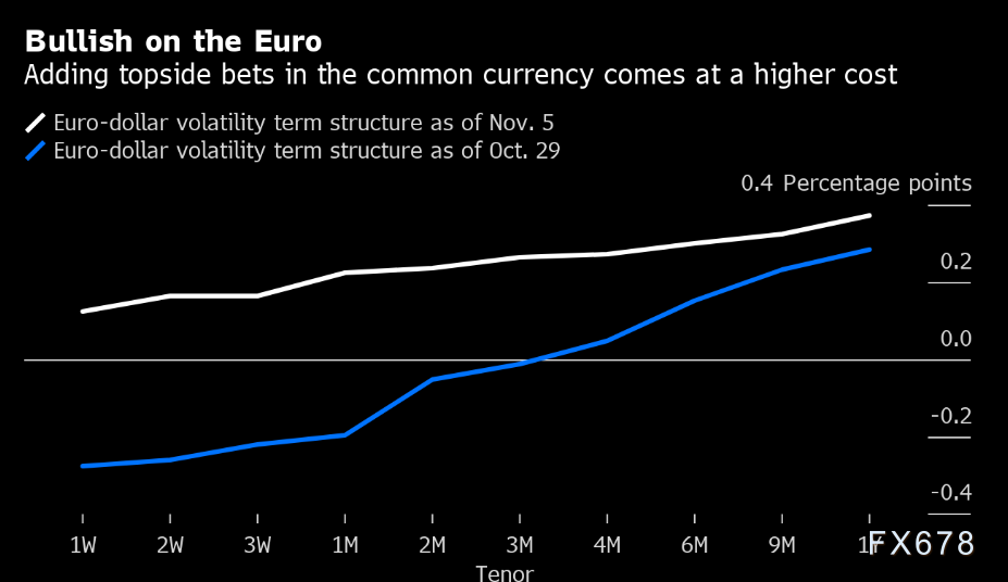欧元兑美元本周创7月以来最大涨幅,期权交易员押注明年进一步看涨,因为拜登濒临赢得美国大选的边缘。