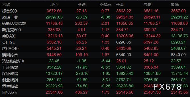 美股三大指数收盘涨跌不一,道琼斯指数收盘下跌23.30点,跌幅0.08%,报29397.63点;标普500指数收盘上涨27.10点,涨幅0.77%,报3572.66点;纳斯达克指数收盘上涨232.60点,涨幅2.01%,报11786.43点。