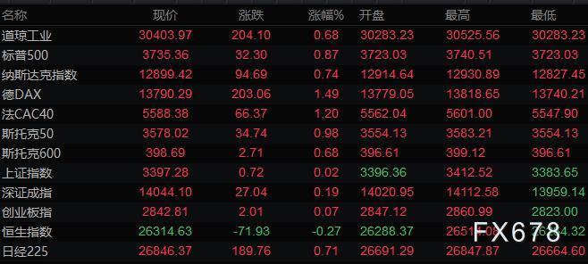 美股三大指数收盘齐创新高,道琼斯指数收盘上涨204.10点,涨幅0.68%,报30403.97点;标普500指数收盘上涨32.30点,涨幅0.87%,报3735.36点;纳斯达克指数收盘上涨94.70点,涨幅0.74%,报12899.42点。