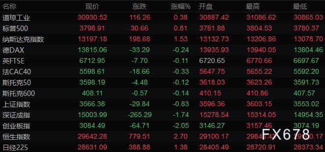 美股三大指数全部收涨,标普500指数收盘上涨30.70点,涨幅0.81%,报3798.91点;纳斯达克指数收盘上涨198.70点,涨幅1.53%,报13197.18点;道琼斯指数收盘上涨116.30点,涨幅0.38%,报30930.52点。
