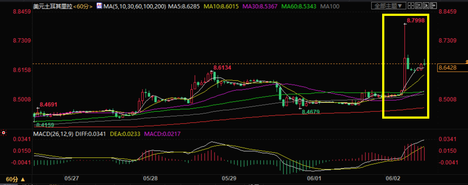 在疯狂上涨之后,目前美元/土耳其里拉回落至8.6170附近。分析师指出,除非跌破始于4月中旬的上升趋势线支撑(8.4330附近),否则美元/土耳其里拉仍有望进一步走强。