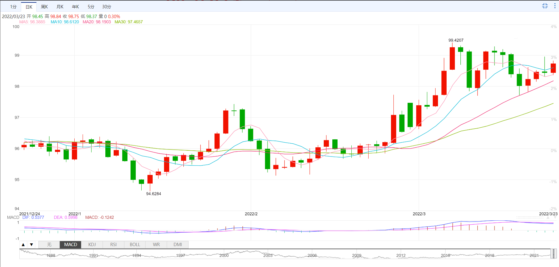 美元指数:截止北京时间20:00,美元指数小幅上涨,现报98.70,涨幅0.26%。纽市盘前,美元指数温和回升至98.50水平附近。美元指数重新获得上行动力,收复了周二在风险相关资产出售基调的支持下失去的阵地,同时美国国债收益率近期强劲上涨的势头似乎暂时失去了一些动力。美元指数上涨0.15%,达到98.56,突破98.86(3月22日高点)将打开通往99.29(3月14日高点)的大门,最终达到99.41(2022年3月7日高点)。另一方面,下方初步支撑位于97.72(3月17日低点),接着是97.71(3月10日低点),然后是97.44(1月28日高点)。