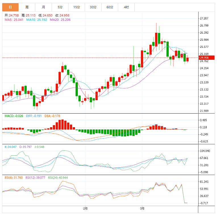 现货白银:截止北京时间20:00,现货白银小幅上涨,现报24.95,涨幅0.73%。纽市盘前,银价恢复了积极的牵引力,回升至25美元的心理关口上方。这一上扬让白色金属扭转了隔夜跌至多日低点的劣势。白银/美元再次找到了不错的支撑,并守住了22.00- 26.95美元的50%斐波那契回撤位。随后的强势有利于看涨的交易者,并支持了进一步上涨的前景。话虽如此,日线图上的中性技术指标值得谨慎。因此,谨慎的做法是等待持续突破38.2%斐波那契回撤位,再为白银的进一步升值做准备。下一个相关阻力是25.40-25.50美元区域附近,若突破该区域,动能可能延伸至26.00美元关口。白银/美元可能会加速向中间阻力位26.40美元的移动,甚至达到27.00美元整数关口。