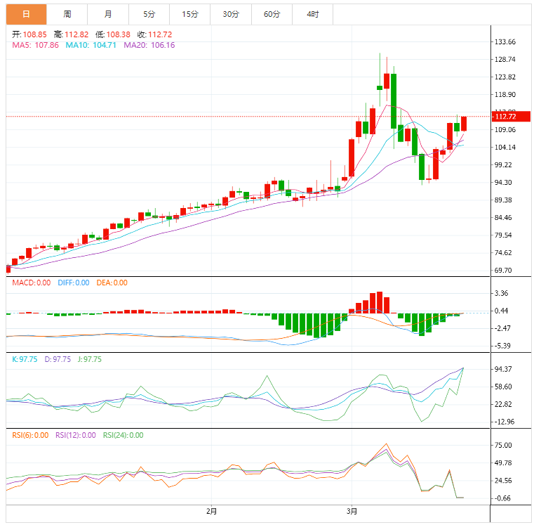 原油市场:截止北京时间20:00,美油大幅上涨,现报112.70美元/盎司,涨幅3.16%。纽市盘前,WTI原油在114美元/桶附近遭遇阻力。俄罗斯和乌克兰之间的地缘政治紧张局势仍在加剧,这促使欧盟考虑对俄罗斯石油实施禁运。如果该计划得以实施,交易员们可能会再次担心全球供应紧缩。相对强弱指数(RSI)也在上升,在显示超买情况或买家精疲力竭之前,还有更多的上升空间。38.2%的水平接近100美元/桶的主要心理关口,而50%的延伸点在96.16美元/桶。更大的卖压可能会将其压低至每桶91.94美元的61.8%或86.71美元的76.4%。全面延期的价格为78.26美元/桶。