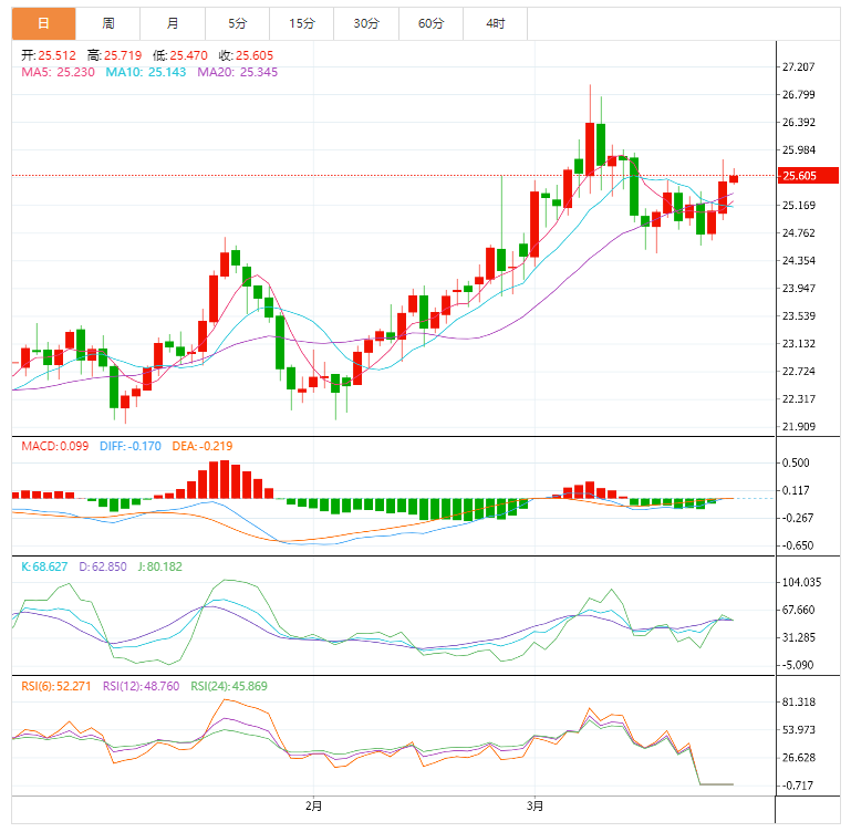 现货白银:截止北京时间20:00,现货白银小幅上涨,现报25.60,涨幅0.33%。纽市盘前,白银依然承压于25.50美元附近。不过白银价格录得连续第三日上涨。前一日价格升至近两周新高。不过未能突破2-3月升势的23.6%斐波回档位25.80美元且MACD信号看跌也对白银的上涨构成挑战。汇价最新跌势关注再度测试10日MA均线25.16美元,之后将指引空头指向50%斐波回档位和50日MA均线,它们分别位于24.50美元和24.20美元。相反,若明显升破23.6%斐波回档位25.80美元,银价将再度反弹并指向26美元。