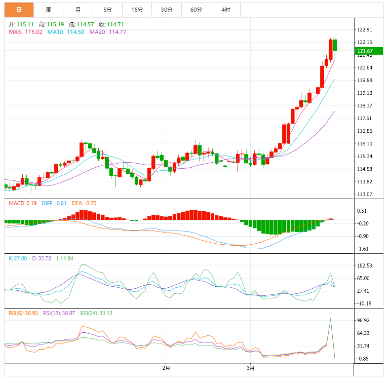 美元/日元:截止北京时间20:00,美元/日元下跌,现报121.68,跌幅0.57%。纽市盘前,美元兑日元很快从日低反弹了几个点,最后在略低于122.00整数关口下方交投,但当天仍下跌了0.35%以上。美元兑日元见证了从122.50水平的盘中逆转,也就是周五早些时候触及的2015年12月以来的最高水平,并逆转了隔夜的大部分强劲涨幅。这一大幅回调可能完全归因于在极度超买环境下的一些获利回吐和美元温和走软。就目前而言,美元兑日元似乎已经结束了连续五天的涨势,仍受美元价格走势的影响。市场参与者现在期待着美国的经济议程,北美市场稍后将发布修正后的密歇根消费者信心指数和成屋待完成销售数据。