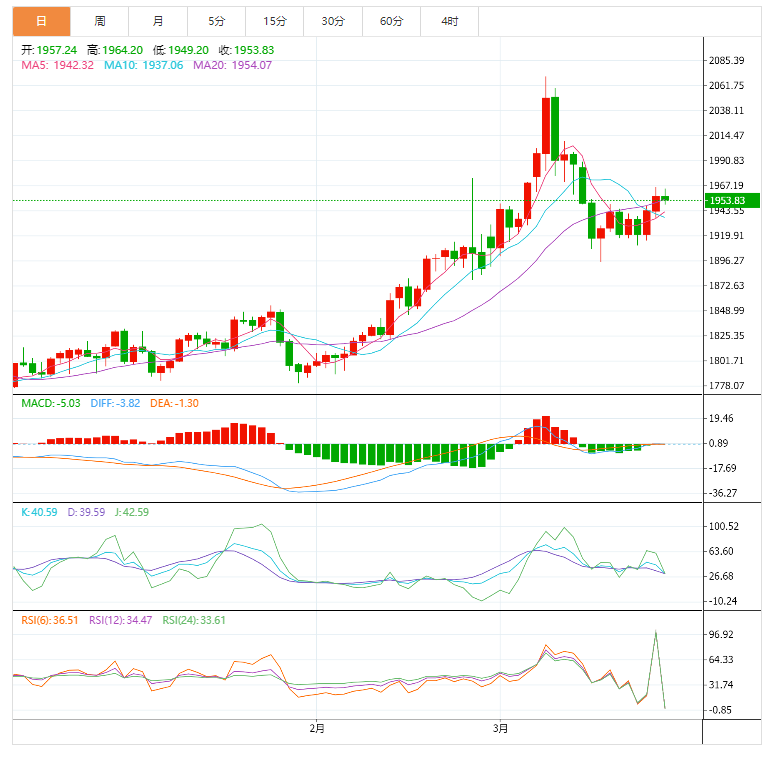 现货黄金:截止北京时间20:00,现货黄金下跌,现报1953.87美元/盎司,跌幅0.17%。纽市盘前,国际金价持稳,俄乌和谈缺乏实质性进展提振了避险黄金,但美债收益率因担心美联储更积极地收紧货币政策而飙升,削弱了黄金的吸引力。美联储在3月16日升息25个基点,决策者此后还发出信号,今年将采取更积极的货币政策紧缩,暗示不排除一次升息50个基点,以对抗不断上升的通胀。市场预计美联储到2023年2月将升息至2.4%,并预计美联储在5月升息50个基点的可能性为76.8%。若强势跌破100周期移动均线阻力位(目前为支撑位),则将引发金价大幅下滑至21周期移动均线1939美元。下一个支撑位在50日移动均线1933美元,突破该支撑位将导致空头进一步看向上扬的200日移动均线1923美元。接下来,3月22日低点1911美元将是黄金卖家需要关注的水平。