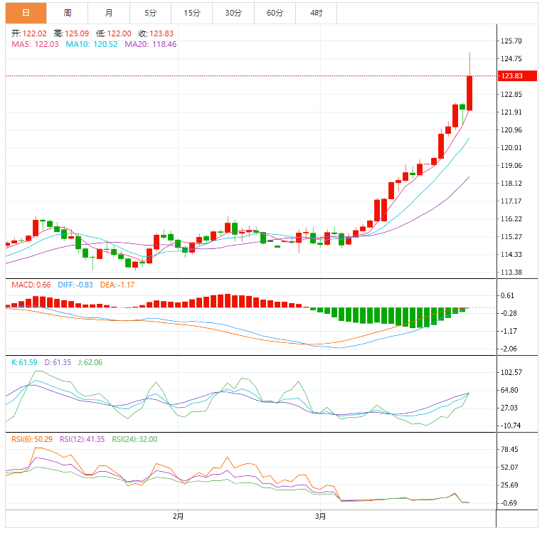 美元/日元:截止北京时间20:00,美元/日元上涨,现报123.84,涨幅1.44%。纽市盘前,美元兑日元继续上涨,自2015年8月以来首次突破125心理关口。继上周五小幅回落后,美元兑日元在本周第一个交易日获得大量买盘,此前日本央行采取行动抑制收益率持续上升。事实上,日本央行在一天之内两次宣布以无限量的方式购买日本10年期国债以保护在收益率曲线控制政策下0.25%的收益率容忍上限。因此汇价在过去一个小时的暴涨可以归因于技术性买盘。由于指标严重超买,在建立新的多头头寸之前保持谨慎。在缺乏数据情况下,美债收益率,美元走势和更广泛的市场风险情绪应推动美元兑日元。