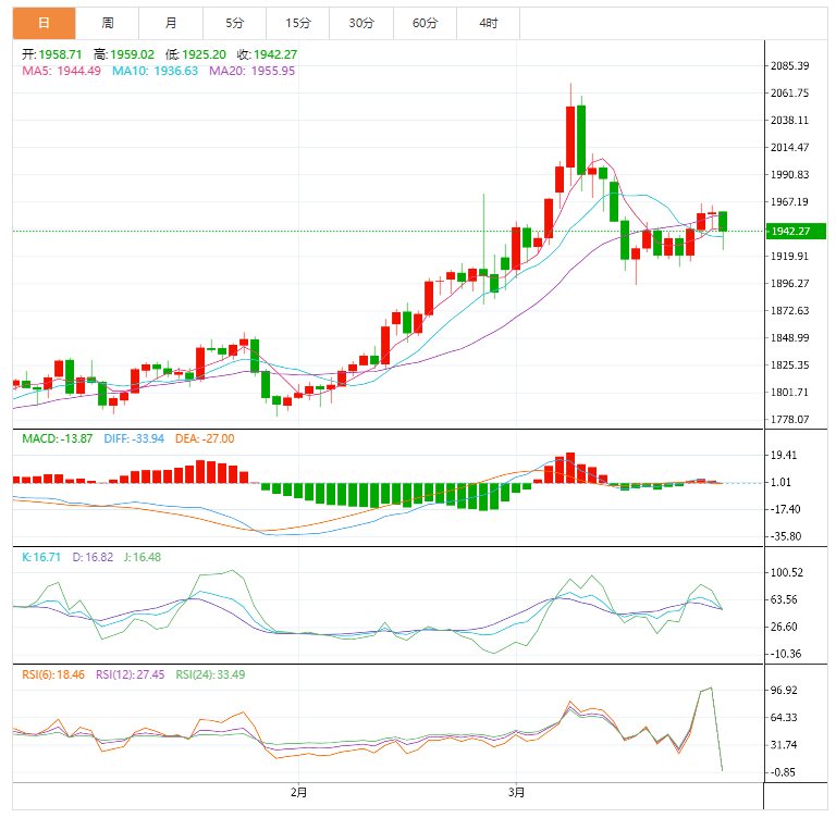 现货黄金:截止北京时间20:00,现货黄金下跌,现报1941.56美元/盎司,跌幅0.79%。纽市盘前,金价跌破1930美元的水平,这是多种因素共同推动的结果。乌克兰总统弗拉基米尔·泽伦斯基(Volodymyr Zelensky)周日表示,他们准备与俄罗斯讨论以中立身份作为和平协议的一部分。本周晚些时候,俄罗斯和乌克兰将在土耳其举行停火会谈,人们希望通过外交途径结束战争。这反过来又被视为削弱避险资产黄金/美元的关键因素。从技术角度来看,最近自1900美元下方的反弹止步于自2070美元区域暴跌的38.2%斐波那契回撤位附近。随后下滑至23.6%斐波那契回撤位以下可能会让交易偏向看跌交易员,并支持进一步下跌的前景。因此,进一步出现后续抛售并测试下一个相关支撑位约1918-1916美元区域的可能性非常大。