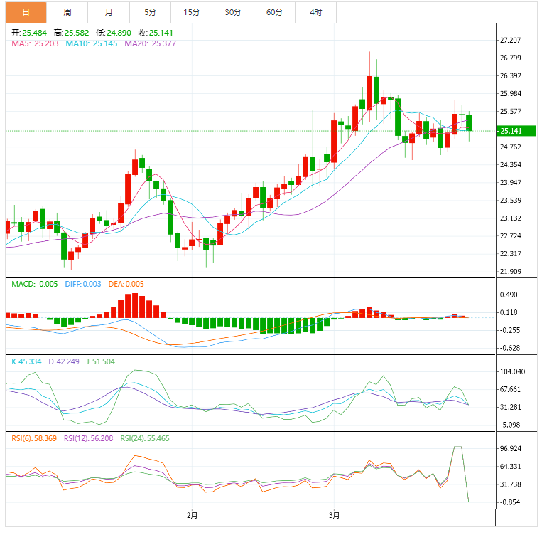 现货白银:截止北京时间20:00,现货白银小幅下跌,现报25.16,跌幅1.38%。纽市盘前,白银价格盘中下跌0.30%至25.45美元,印证了上周五的看跌走势。除了趋势逆转暗示日线图上的烛台,RSI线的稳定也支持下行势头。白银价格目前已跌向50-HMA和一周以来的支撑位,分别在25.40美元和25.35美元附近。在白银价格持续看跌超过25美元的情况下,接近24.30美元的月度低点将成为焦点。在此之后,上周的高点25.85美元和26.00美元的门槛将考验白银价格多头。