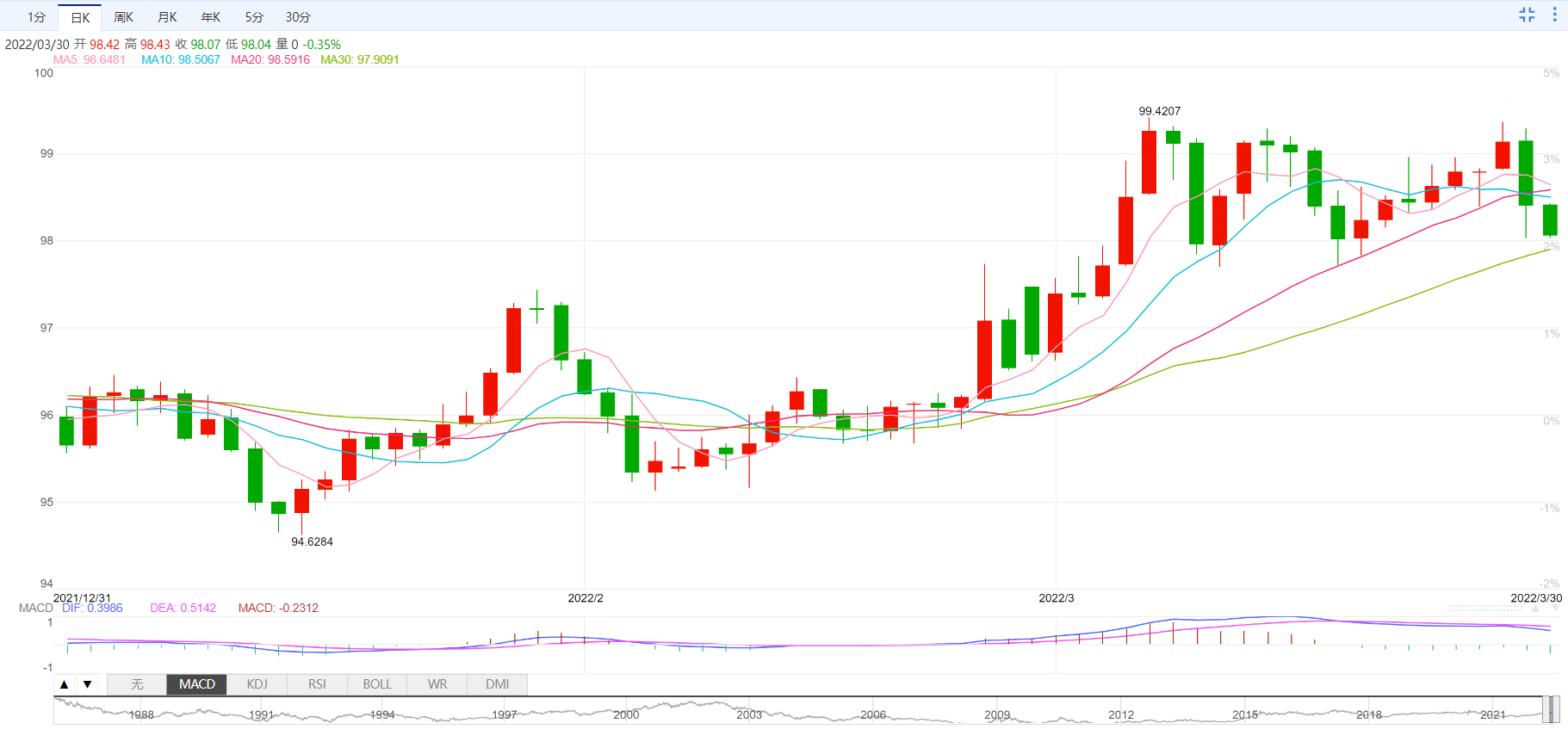 支撑位:98.53 98.24 98.09