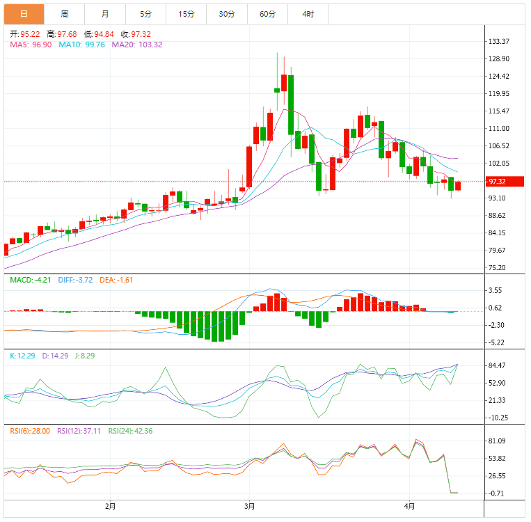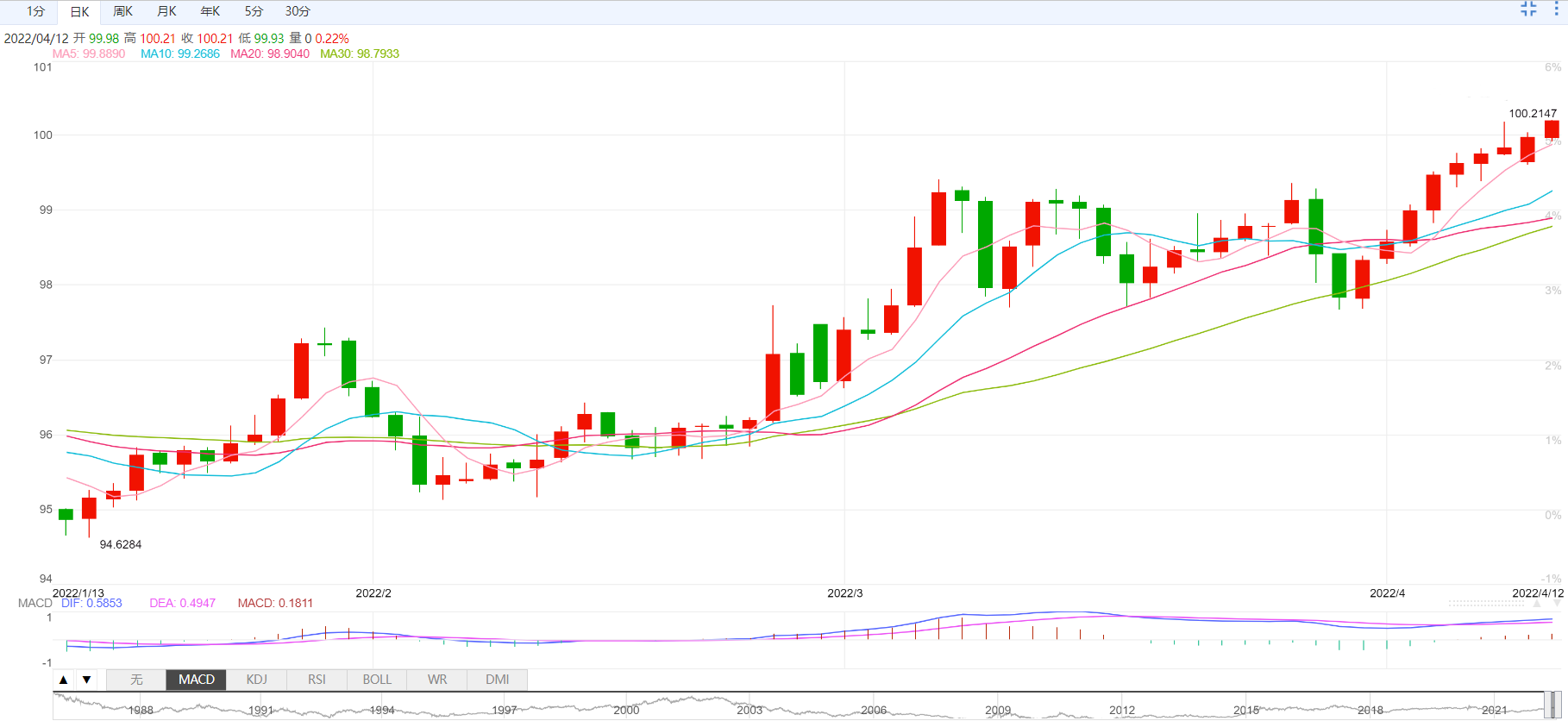 美元指数:截止发稿,美元指数上涨,现报100.20,涨幅0.22%,欧市盘前,美元指数自高点显著回落,该指数一度跌至99.75附近,此前亚市盘中一度突破100大关。美元指数似乎正在与美国国债收益率分道扬镳,因为美元指数表现平平,而美国国债收益率却在稳步走高。随着投资者开始押注美联储(Fed)将于5月大幅加息,美国10年期国债收益率已攀升至近2.77%。