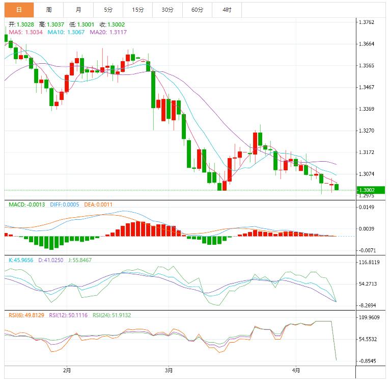 技术面:汇价遇阻200 周期指数均线1.3300后急剧下跌。汇价交投于前期的关键底部附近,即3 月14 日低点1.3000。通常,若汇价跌破关键底部将维持长期看跌货币。3 月23 日高点 1.3300 以来的趋势线与4 月5 日高点处在1.3167 将成为后市强阻力。