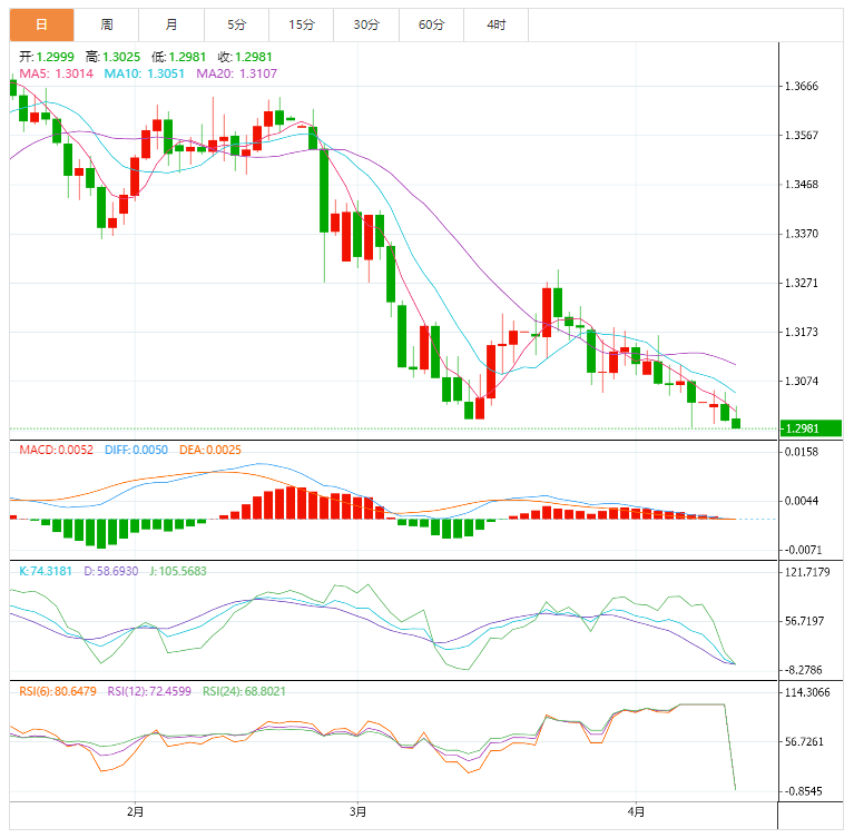 技术面:英镑整理于 12982-1.3057 的窄幅区间。值得注意的是,汇价整理于关键底部附近,即3 月低点1.3001。通常,汇价在同样处在心理关口的前一个底部附近出现大幅盘整表明汇价将构筑双底。但汇价仍有望跌破盘整区间,汇价可能进入长线看跌通道。连接 3 月23 日高点1.3300 与4 月5 日高点1.3167 的趋势通道,将构成后市强阻力。