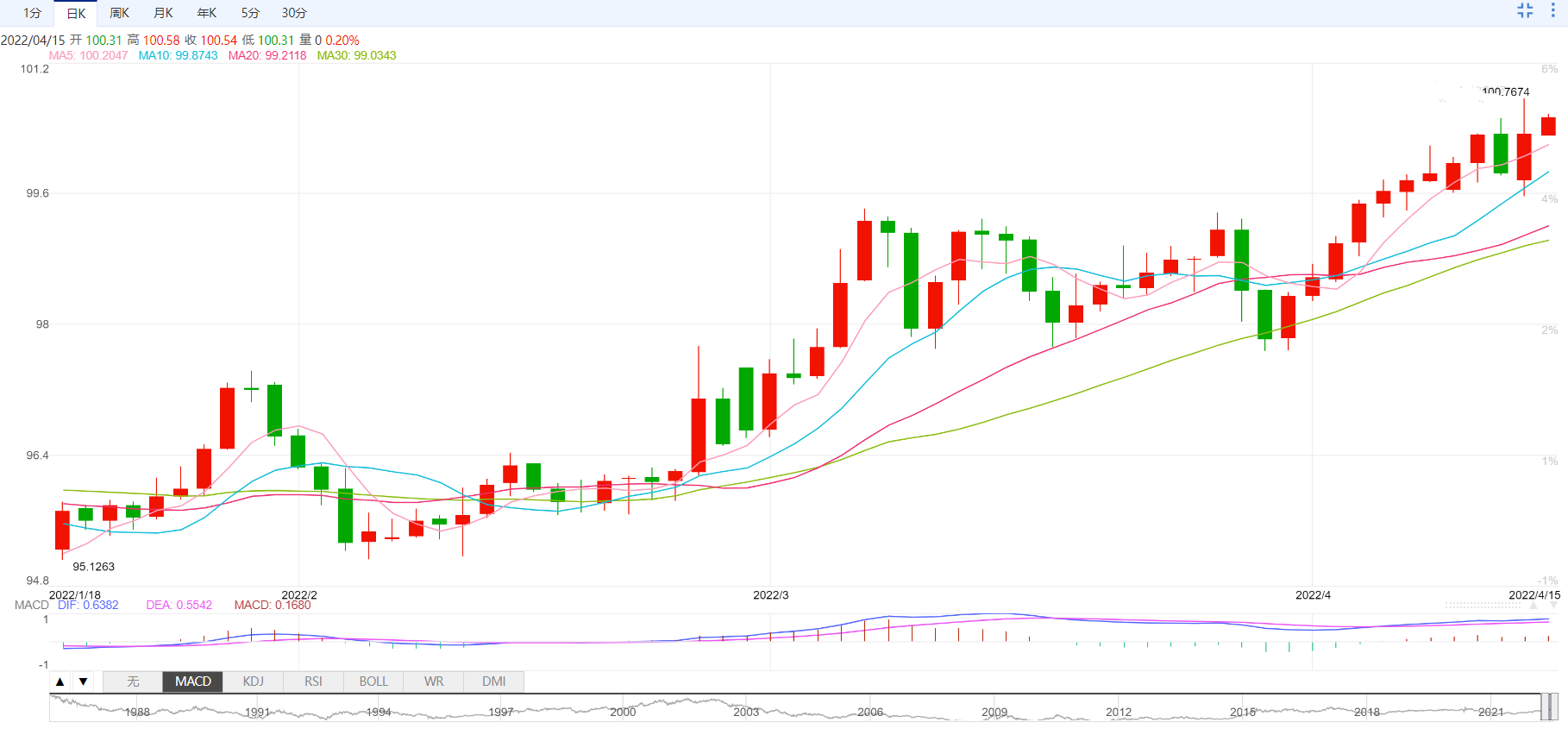 美元指数:截止发稿,美元指数上涨,现报100.54,涨幅0.21%,欧市盘前,美元指数在纽约尾盘从年度高点100.76小幅调整至100.34。周五稍早,美元指数从周四99.60的低点强劲反弹。美元指数似乎追随了10年期美国国债收益率的反弹,后者收复了连续两天的失地,并回升至2.83%的三年高点。密歇根大学公布的消费者信心指数(CSI)上升,为美元指数注入了新鲜血液。密歇根CSI指数已降至65.7,优于市场共识的59和此前的59.4。尽管通胀飙升,乌克兰危机的不确定性,以及供应链的中断,但消费者对美国经济活动的信心有所提高,这震惊了外汇领域,并因此推动了强势的美元。