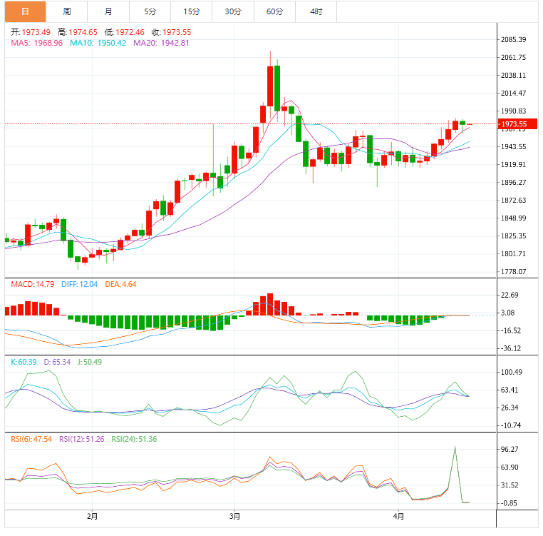 现货黄金:截止北京时间20:30,现货黄金下跌,现报1972.47美元/盎司,跌幅0.05%。纽市盘前,金价为每盎司1972.470美元,隔夜一直在1960.60美元至1980.43美元之间波动。迄今为止,金价一直维持在1,97.46美元至1,973.50美元的区间。美元走强,在欧洲央行(ecb)降息后,美元指数再创周期新高。此外,纽约联邦储备银行(New York Fed)行长约翰·威廉姆斯(John Williams)周四表示,美联储应合理考虑在5月的下次会议上加息0.5个百分点。这被认为是对货币市场的鹰派暗示,因为更鸽派的政策制定者正开始与鹰派站在同一阵线。