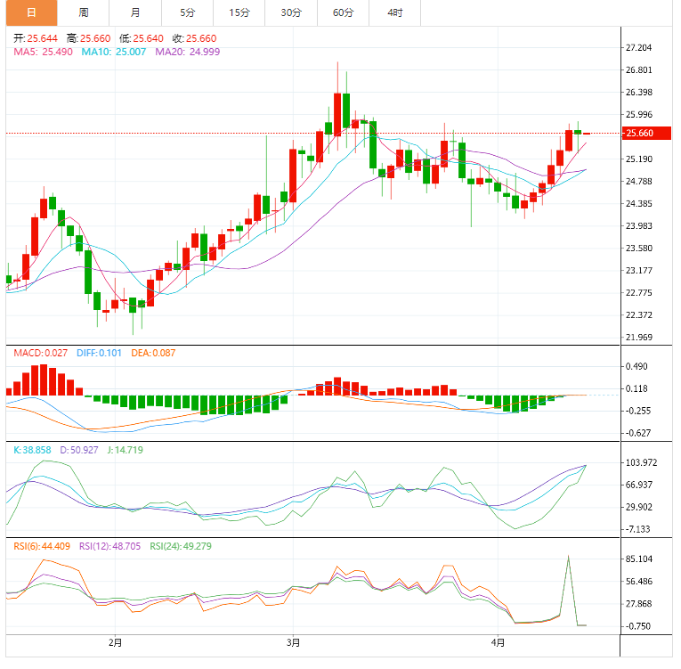 现货白银:截止北京时间20:30,现货白银小幅下跌,现报25.64,跌幅0.04%。纽市盘前,白银在每盎司25.50美元附近,美国3月零售销售报告将在北京时间2030公布,美国密歇根消费者信心初步调查在2200公布,然后美联储官员在今天晚些时候发表讲话。美国债券收益率和美元继续走软,尽管在即将到来的风险事件之前的获利回吐以及最近几天的强劲表现阻止了白银/美元进一步接近26.00美元的缺口。