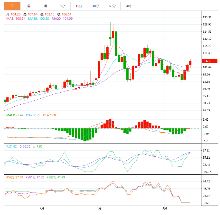原油市场:截止北京时间20:30,美油大幅上涨,现报106.43美元/盎司,涨幅2.20%。纽市盘前,WTI油价守住 3 月15 日的关键底部92.37 美元。WTI油价已经连续三天上涨,并且继突破周四高点107.00 美元后可能会扩大涨幅。相对强弱指标 (14) 已从40.00-60.00 移至60.00-80.00 的看涨区间,表明后市会出现新的波动。WTI油价自周三高点104.02 美元小幅回调将是买家的最佳机会,将至3 月28 日高点109.78 美元,然后是3 月24 日高点至116.00 美元附近。另一方面,若WTI油价跌破20 EMA 100.80 美元,空头将占主导,WTI油价将依次接近支撑位整数关和水平支撑位95.00 美元和92.37 美元。
