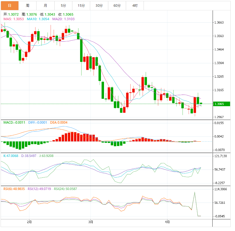 英镑/美元:截止北京时间20:30,英镑/美元下跌,现报1.3063,跌幅0.02%。纽市盘前,英镑/美元自周三低点1.2973 大幅反弹后出现整理。英镑整理接近 20 周期指数均线,并为投资者提供汇价持稳反转的最佳机会。4 小时图构筑双底对英镑多头来说似乎构成利好。继重测 3 月低点1.3000 附近的心理支撑位后,汇价出现大幅上涨空间。英镑/美元构筑双底形态,表明在没有大量卖盘的情况下出现看涨反转,同时重测关键底部。3 月3 日高点1.3418 以来的趋势连接3 月23 日高点1.3299,维持成为强阻力。