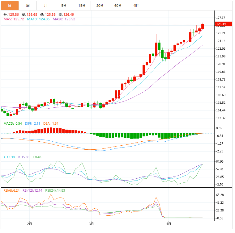 美元/日元:截止北京时间20:30,美元/日元上涨,现报126.51,涨幅0.49%。纽市盘前,美元兑日元汇率为125.89。随着时间的推移,俄乌冲突愈演愈烈,停火似乎不太可能。尽管网上会谈仍在继续,但乌克兰外交部长表示没有任何进展。在俄罗斯方面,有报道称,乌克兰在黑海用导弹袭击了一艘俄罗斯军舰,而俄罗斯国防部长补充说,其旗舰舰队莫斯科号已经沉没,这意味着局势仍在升级。美元/日元价格在日线图上呈现出一个倒锤和一个普通锤的上升趋势,这意味着上升趋势是过度扩张的。相对强弱指数(RSI)在80.91达到了较低的高点,而美元兑日元达到了今年迄今的新高126.31,这意味着负背离正在形成。