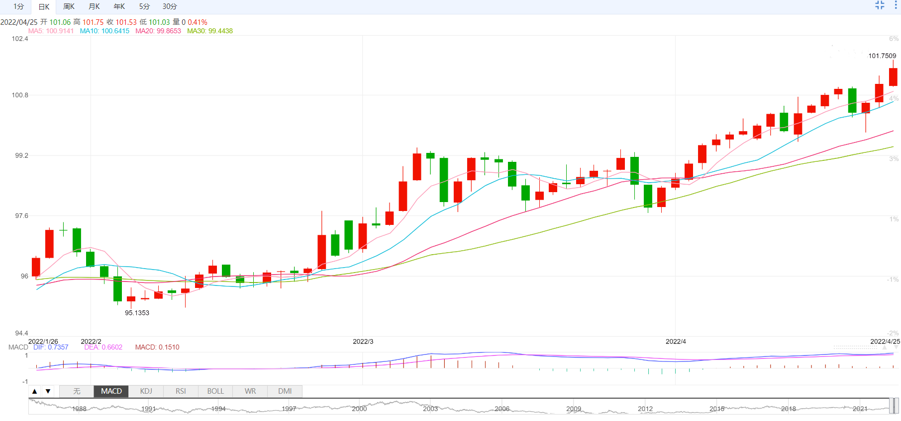 美元指数:截止北京时间20:30,美元指数小幅上涨,现报101.52,涨幅0.40%。纽市盘前,美元在本周初回吐了稍早的部分涨幅,升至101.70 - 75区域的周期新顶。美元面临新的买入兴趣,并挑战超过101.00的2022年高点。到目前为止,美元的价格走势仍然受到美联储加息可能性以及地缘政治因素的影响。此外,美元走强的理由还得到了美国高收益率和美国经济稳健表现的有力支撑。技术面上,美元指数在101.50点上涨0.38%,突破101.73点(2022年4月25日的高点)将打开通往101.91点(2020年3月25日的高点)的大门,最后是102.99点(2020年3月20日的高点)。另一方面,最初的争夺出现在99.81(4月21日的周低点),其次是99.57(4月14日的周低点),然后是97.68(3月30日的周低点)。