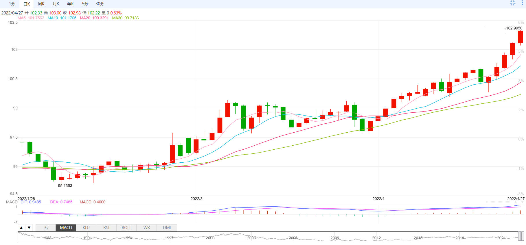 美元指数:截止北京时间20:30,美元指数小幅上涨,现报102.97,涨幅0.62%。纽市盘前,美元指数保持了良好的买入压力,并在102.00上方稳健运行。周三到目前为止,美元加速并以相当令人信服的方式超过了关键的102.00。持续的避险情绪、地缘政治因素以及美国经济反弹,都与美元的上行势头相互配合。美元指数上涨0.22%至102.52和102.74的爆发(2022年4月27日高)敞开大门的102.99(2020年3月20日高)最后103.82(2017年1月3日高)。另一方面,最初的竞争出现在99.81(每周低4月21日)得到了99.57(每周低4月14日),然后97.68(每周低3月30日)。