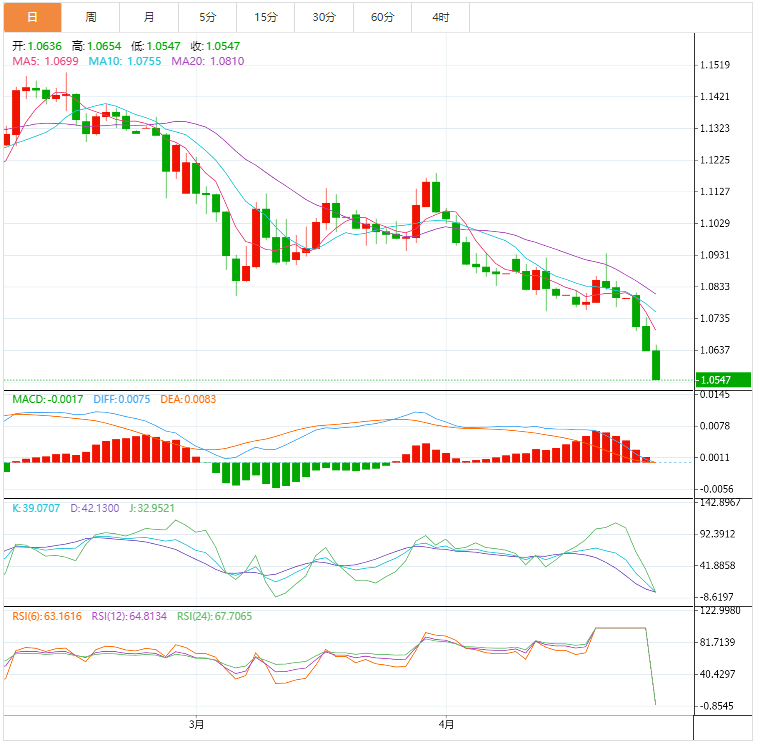 “昨天欧元兑美元的价格走势跌破了新冠肺炎大流行的低点1.0636,下一个下行目标是2017年初的低点1.0341。 ”
