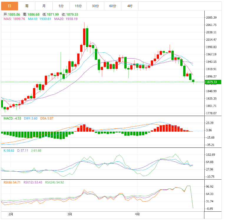 金价周四延续跌势,一度创近10周新低至1871.99美元/盎司,因为美元上涨损及黄金需求,而美联储即将加息也削弱了黄金对冲通胀的吸引力。
