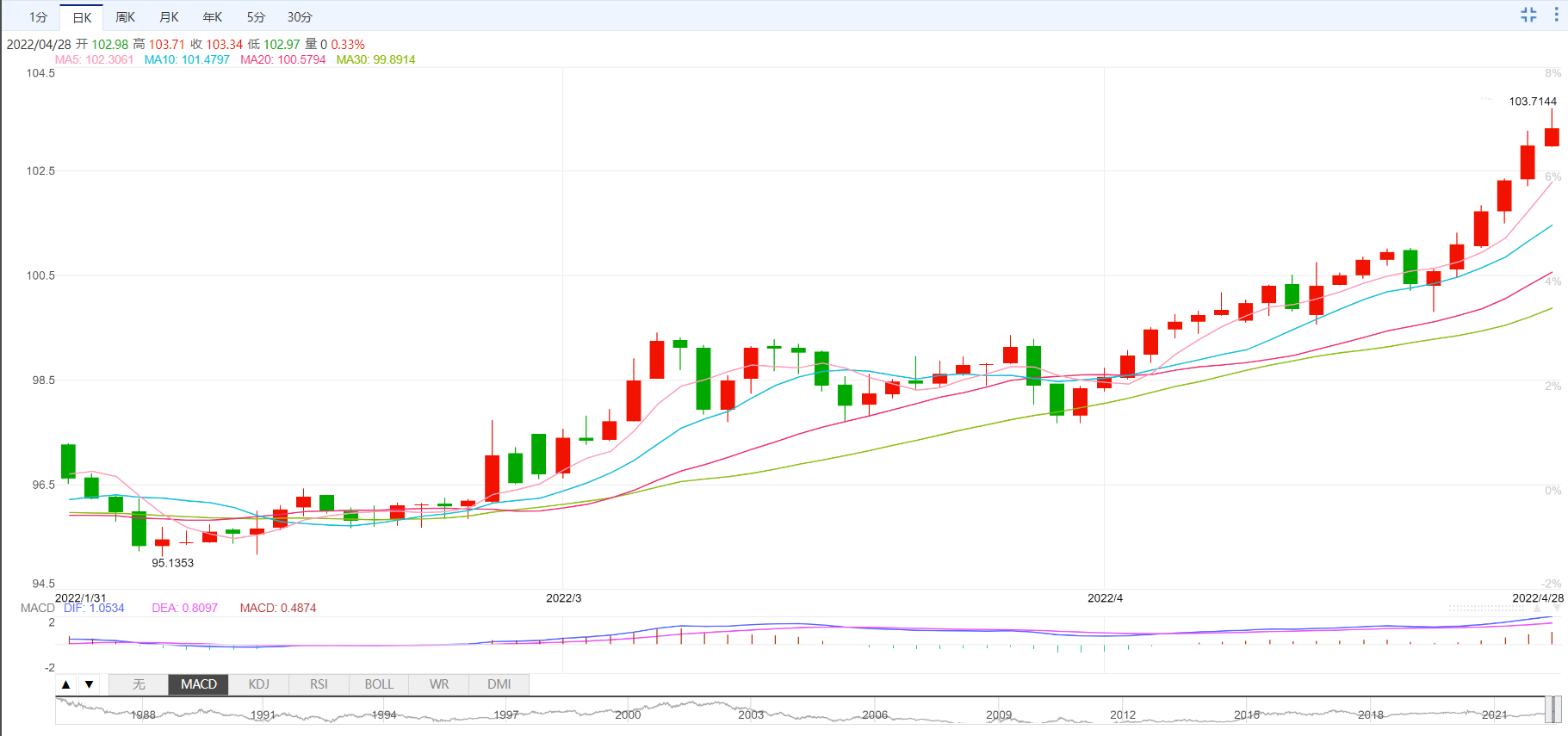 技术面:美元指数上涨0.22%至102.52和102.74的爆发(2022年4月27日高)敞开大门的102.99(2020年3月20日高)最后103.82(2017年1月3日高)。最初的竞争出现在99.81(每周低4月21日)得到了99.57(每周低4月14日),然后97.68(每周低3月30日)。