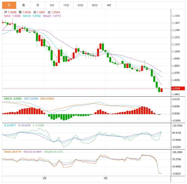 美元指数:截止发稿,美元指数走低,现报103.19,跌幅0.44%,欧市盘前,美元指数从20年高点延伸回调至103.50。在此过程中,美元指标巩固了近期的涨势,因债券市场没有变动,且在美联储青睐的通胀指标公布前市场人气谨慎。接下来,由于美联储态度强硬和避险情绪,美元指数可能继续走强。然而,美国数据的任何令人失望之处,都可能在美联储5月会议之前激活人们期待已久的回调。