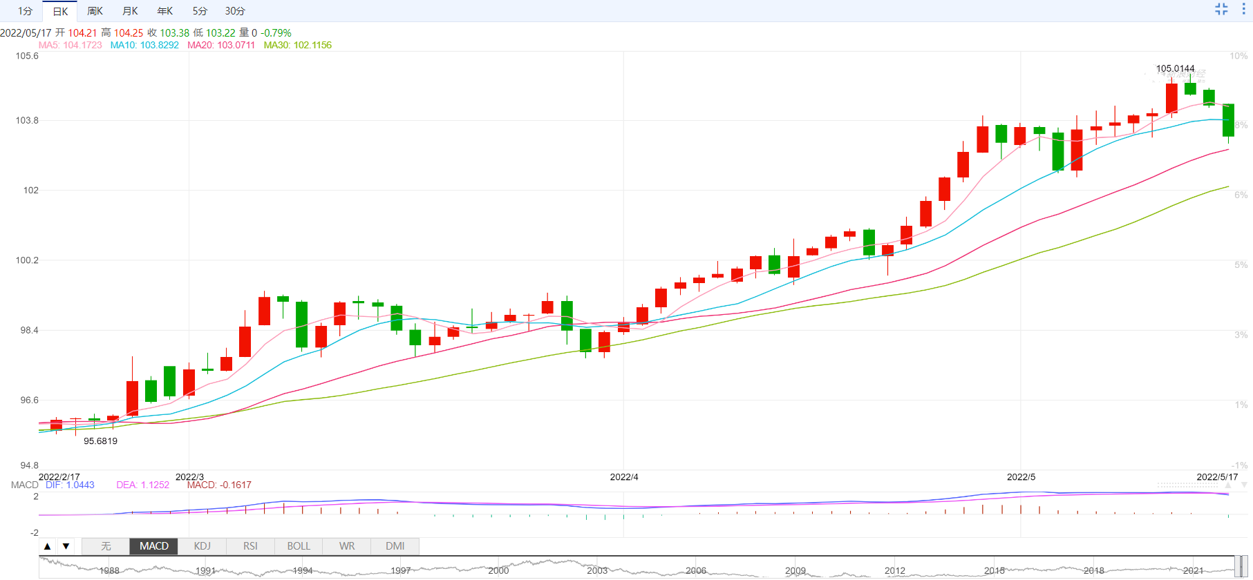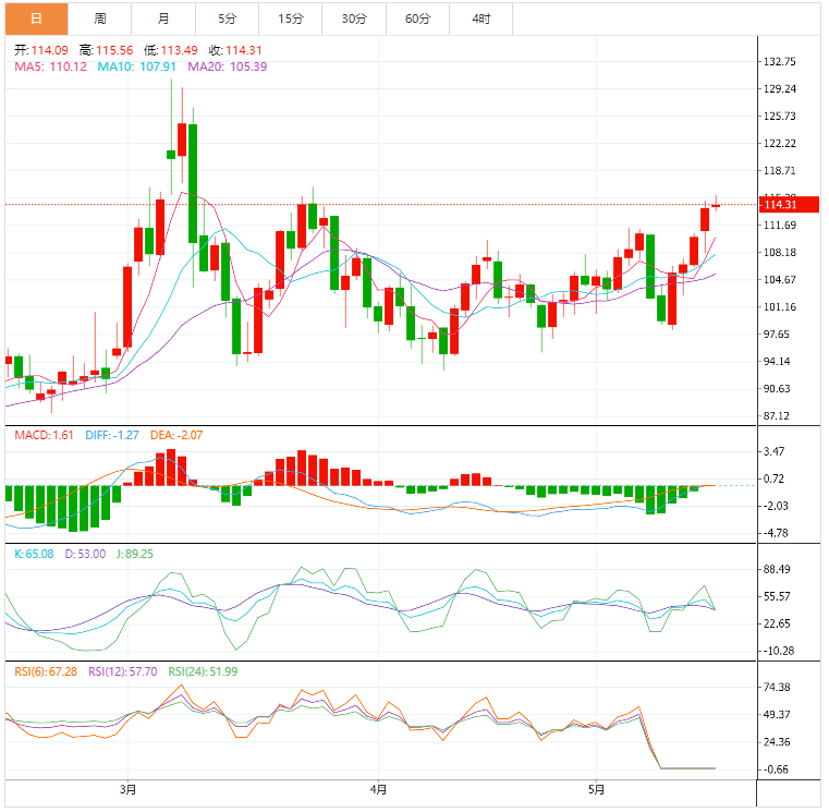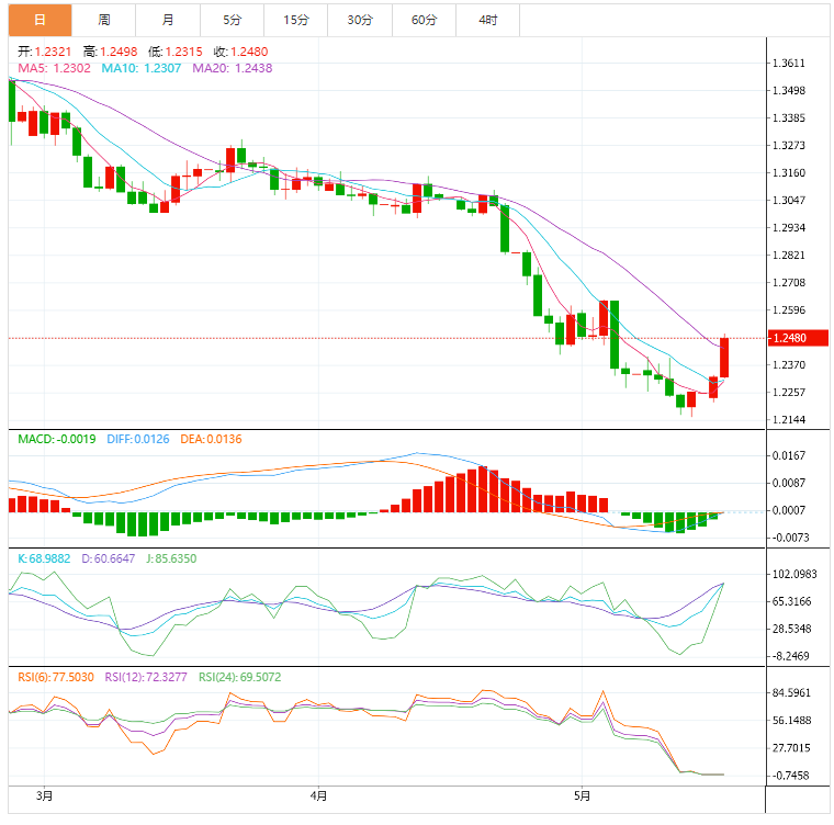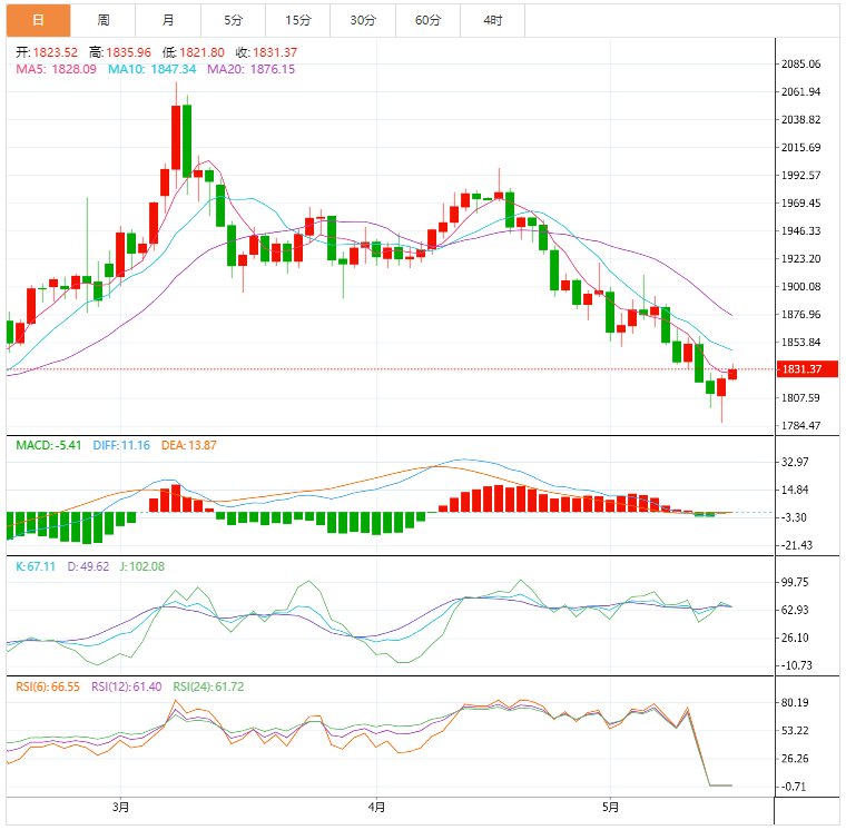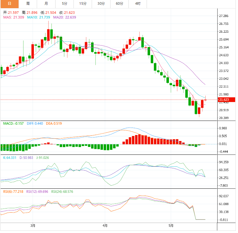 美元指数:截止北京时间20:30,美元指数小幅下跌,现报103.37,跌幅0.80%。纽市盘前,美元继续修正下行,在反弹中突破关键支撑位104.00。美元指数周二连续第三个交易日下跌,并进一步延续上周触及的19年高位105.00附近(5月13日)。美元明显走低之际,投资者对高风险资产的兴趣进一步增强,这也反映在美国国债收益率曲线上的看涨企图上。本月迄今为止,美元在105.00附近遭遇了最初的良好阻力,随后引发了温和的回调。支撑美元的因素包括:投资者对美联储(fed)收紧利率的预期及其与收益率的相关性,当前通胀上升的传言,以及劳动力市场的稳健状况。美元指数下跌0.21%,至103.96,下一个支撑位是102.35(5月5日的低点),其次是99.81(4月21日的周低点),然后是99.57(4月14日的周低点)。