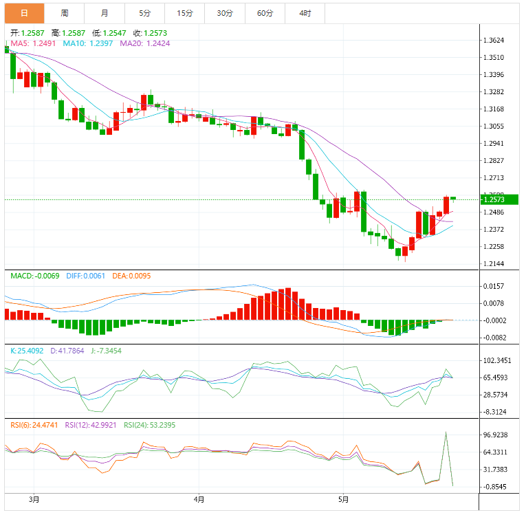 技术面:空头需要明显跌破1.2500(包括一周看跌的上升楔形支撑线)才能重拾控制权。在14天相对强弱指标(RSI)超买之际,前一日汇价未能突破200EMA均线。反弹行情不仅需要突破200EMA均线1.2610,也需要突破楔形上轨线1.2625附近才能有利于英镑兑美元多头。一旦升破1.2615,4-5月跌势的61.8%斐波回档位和五周下降趋势线将吸引多头,它们分别位于1.2275和1.2815附近。