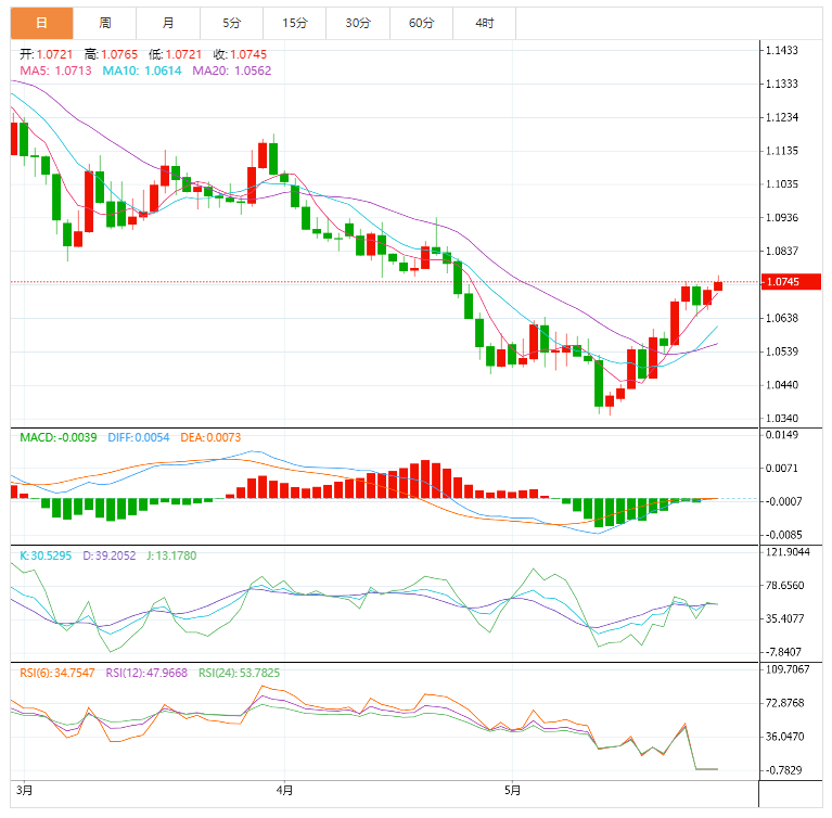 技术面:相对强弱指标(RSI)进入看涨区间60.00-80.00,表明英镑多头强劲。英镑突破3月23日高点1.3300至5月13日低点1.2155之间跌势的38.2%斐波回档位1.2590,这视为看涨反转。汇价企稳于200EMA均线1.2613上方,增加上行动力。此外汇价也企稳于50EMA均线1.2500上方。