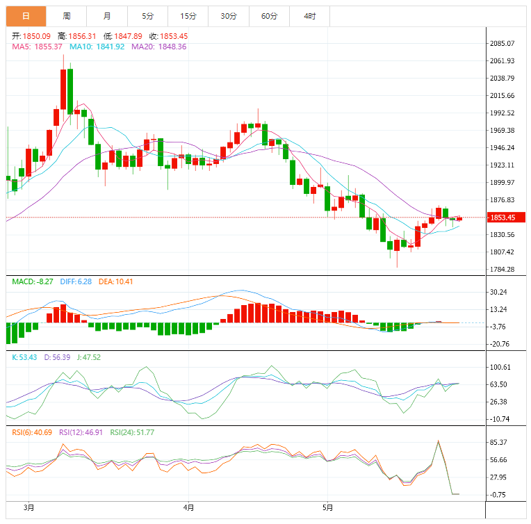 技术面:金价在1840.76-1856.35美元盘整区间,接近5月16日低点1786.94美元的上行趋势线,接近5月19日低点1811.01美元。20期和50期的指数移动平均线(ema)在1856.23美元上给出了看跌交叉,这增加了下行过滤器。与此同时,相对强度指数(RSI)(14)在无交易区域内震荡。