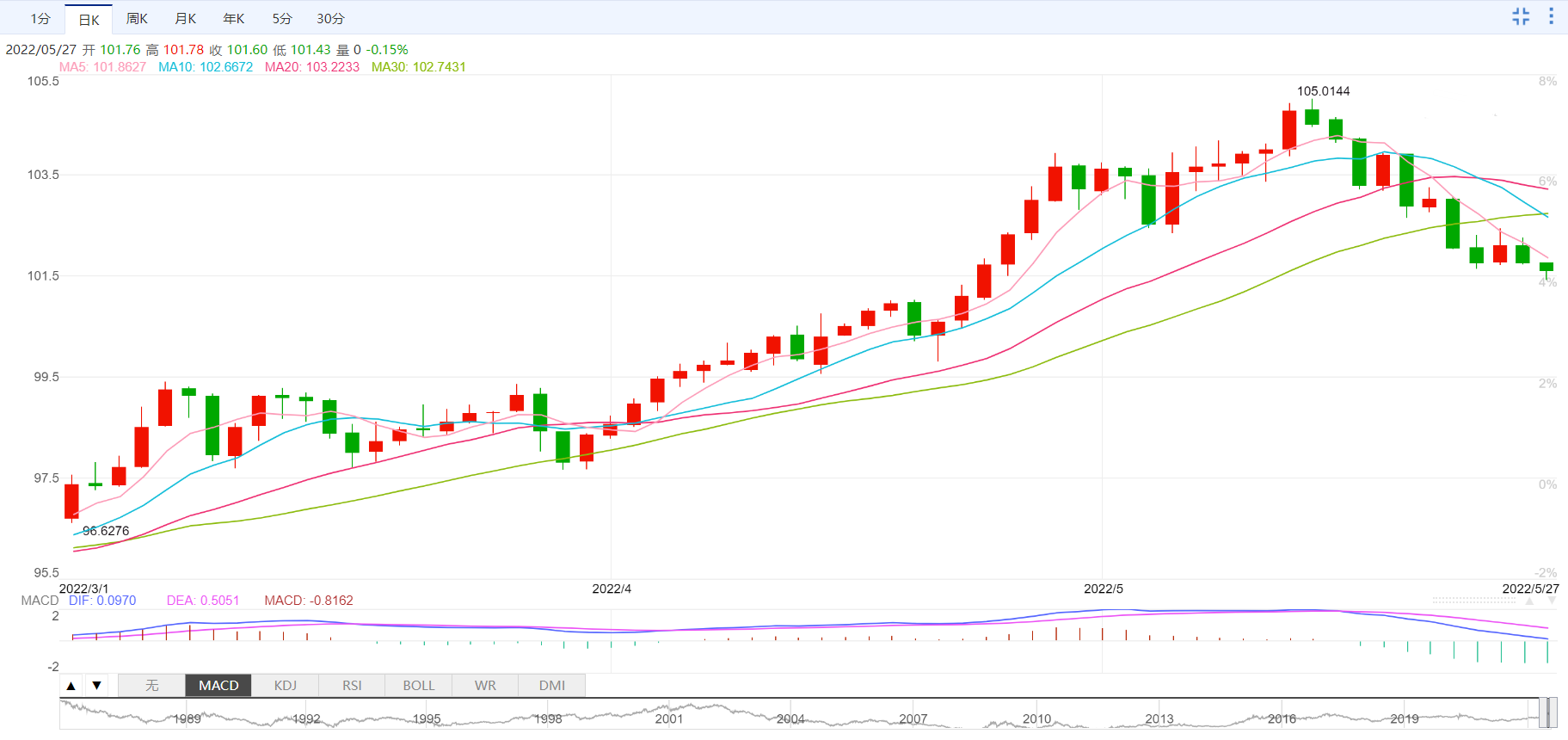 鉴于美国高通胀显出见顶的迹象,美联储明确表示紧缩行动存在着很大不确定性。作为市场的回应,周五(5月27日)美元指数短线大跌,盘中美元指数跌破101.60关口,跌幅一度超0.22%。面对此种行情,投资者普遍认为,美元下行趋势或将延续。