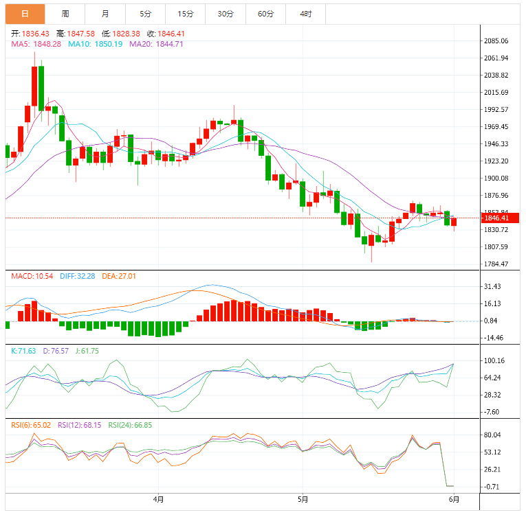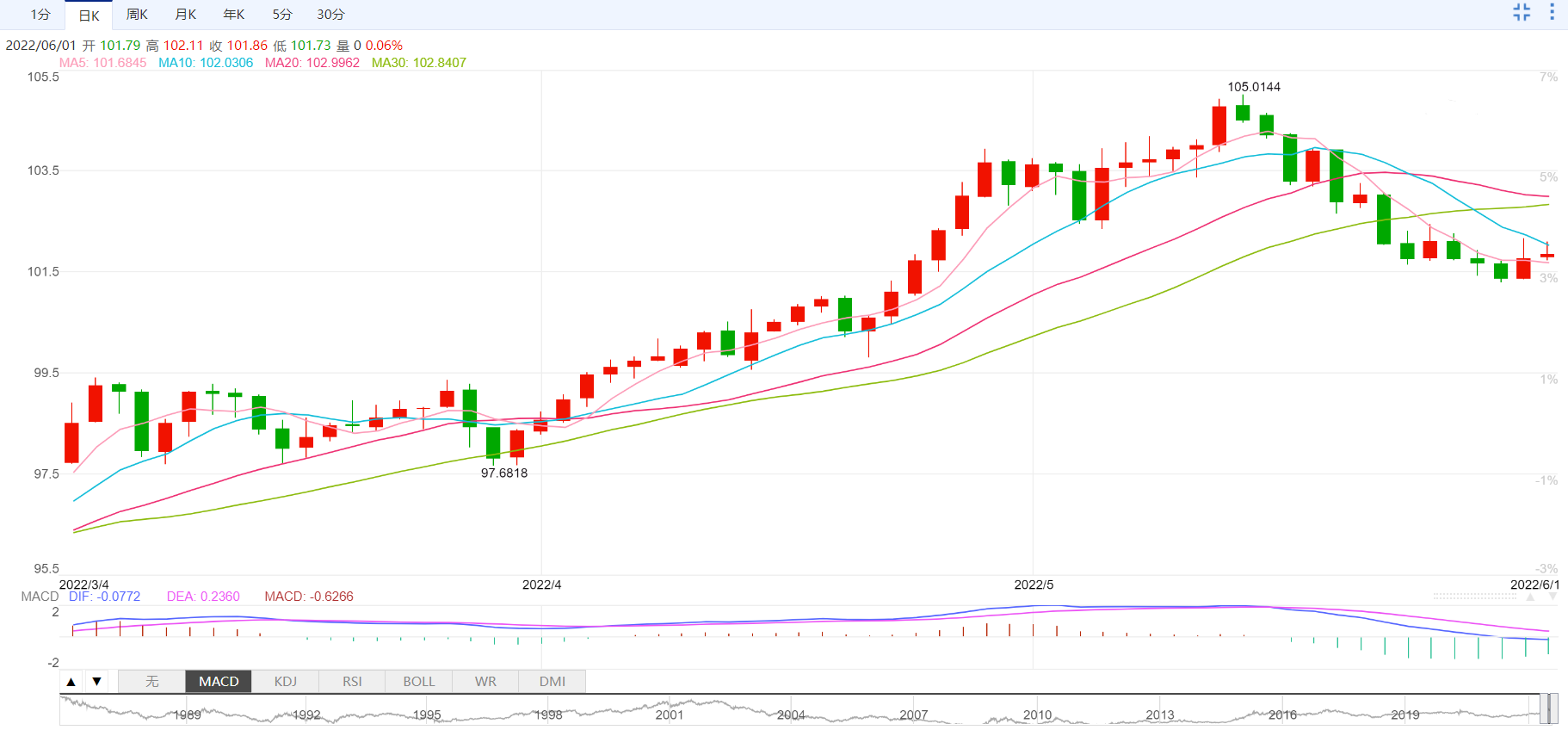 美元指数:截止北京时间20:30,美元指数小幅上涨,现报101.86,涨幅0.06%。纽市盘前,美元指数延续其从周一的数周低点反弹走势,并有望在周中重新回到102.00心理关口以上的区域。美元指数连续第二个交易日上涨,在风险情绪仍处于守势、美国国债收益率恢复稳定的背景下,该指数徘徊在102.00附近。事实上,抛售压力为美国债券市场积聚了动力,并推动收益率恢复上行。也就是说,短端收益率在2.60%左右徘徊,腹部接近2.90%,长端重新瞄准3.10%。美元指数上涨0.20%,至101.98,突破105.00(2022年5月13日高点)将打开升向105.63(2002年12月11日高点)的大门,最终达到106.00(整数关口)。另一方面,下方初步支撑位于101.29(5月30日低点),其次是101.22(55日移动均线),然后是99.81(4月21日低点)。