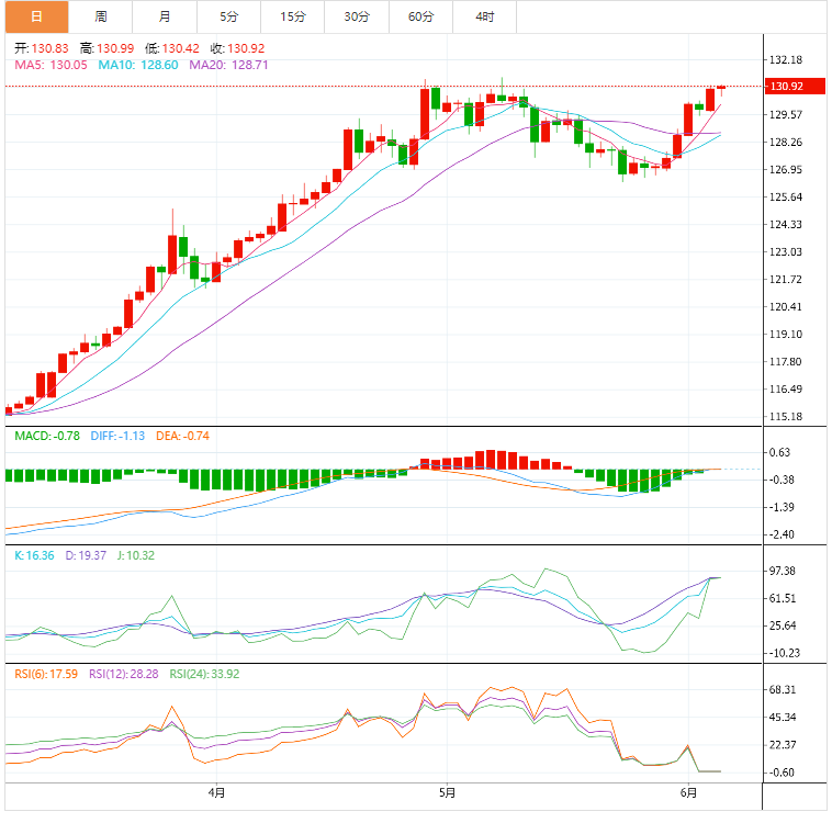 1-3周前景:“自上周初以来我们一直看涨美元兑日元。自上周四(6月2日市价130.05)我们强调汇价将继续走强,但速度将放缓。 '下一阻力位于130.50,然后为130.80。 '上周五,汇价突破130.50和130.80飙高至130.98。虽然汇价可能进一步上涨,但短期超买状况表明汇价在升向下一重要阻力位131.35之前将暂歇。总体上,只有突破129.45(上周五'强劲支撑'水平为129.00)才表明汇价涨势结束。 ”