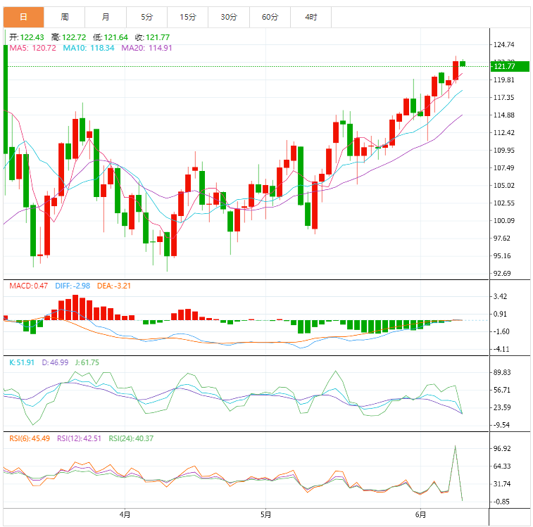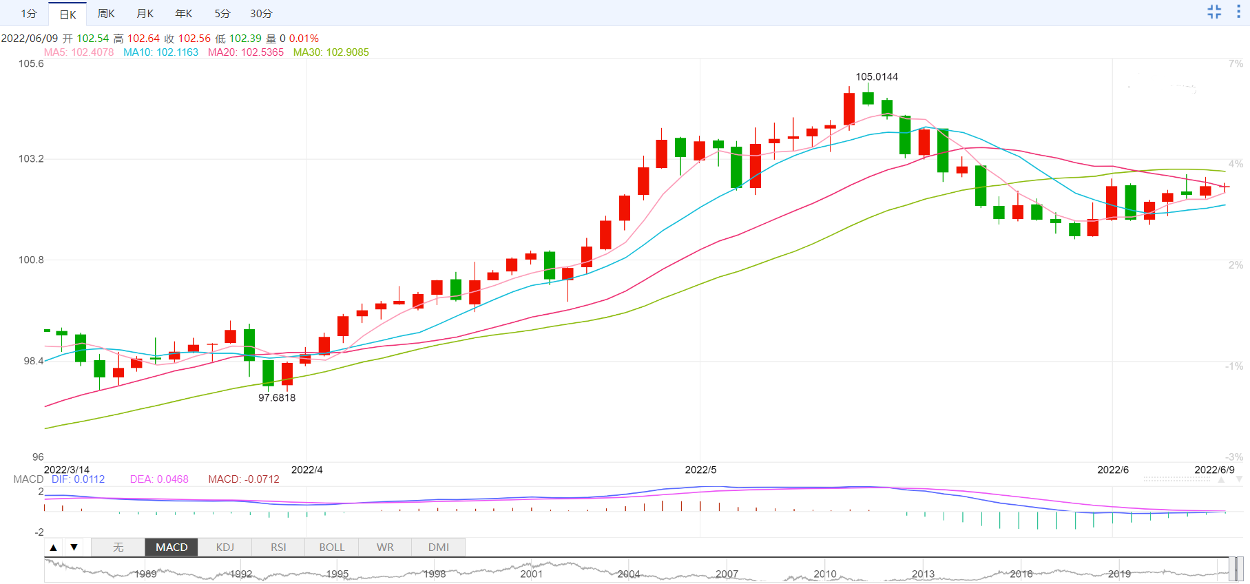 美元指数:截止发稿,美元指数上涨,现报102.55,涨幅0.01%。欧市盘前,美元指数下跌0.08%,接近102.47点,巩固本周涨幅,市场人士准备迎接欧洲央行的强硬立场。“在明天的决定之前,欧洲央行收紧政策的预期有所上升。WIRP表示,7月21日的加息仍完全反映在股价中。”美元走软的部分原因在于美国国债收益率走强,10年期基准利率上升1.5个基点至3.045%。在普遍存在的通胀和经济增长担忧以及主要央行的鹰派希望的背景下,债市空头仍在一个月高点附近徘徊。