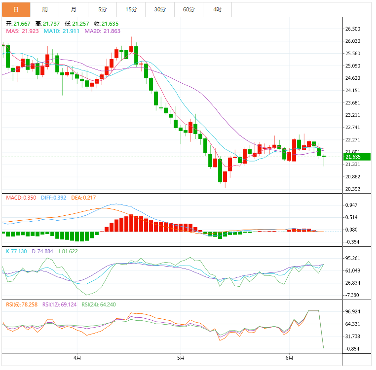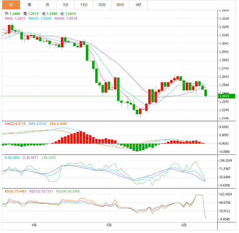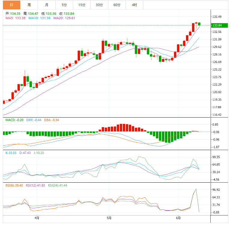 1-3周前景:“昨日(6月9日市价134.35)我们强调,美元兑日元将继续攀升。下一重要阻力位于135.00。汇价随后跌至133.27后反弹并收平于134.33 (+0.07%)。短期上行势头开始消退,加上超买状况降低了汇价升破135.00的概率。不过只要没有跌破132.20(较昨日'强劲支撑'水平不变),则汇价始于上周初的涨势依旧不变。 ”